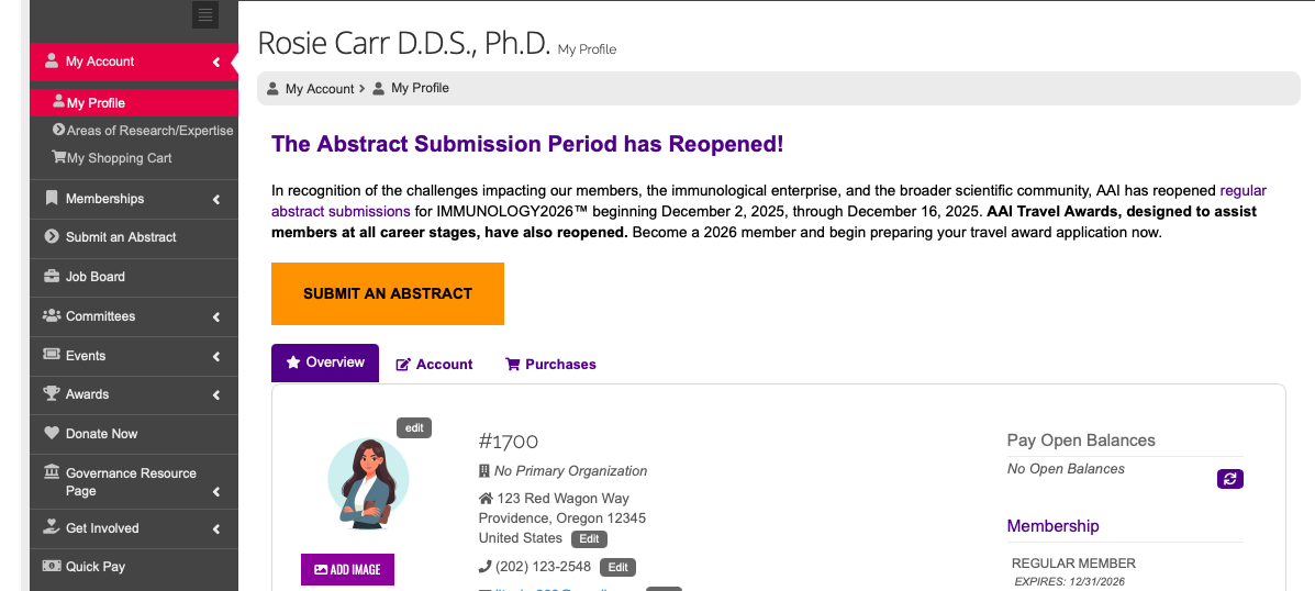 Please Note: An AAI account is required to submit an abstract. AAI has launched a new and improved account platform. To register for an account, please visit members.aai.org. If you already have an AAI account but haven’t accessed the new system yet, go to members.aai.org to request a password reset. You can find more information and guidance in our User Guide. Once you’ve logged in, you can access the Abstract Submission Portal by clicking the “Submit an Abstract” button in your profile (see the screenshot for an example).