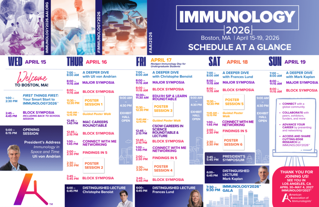 Schedule at a Glance View the IMMUNOLOGY2026™ Schedule at a Glance and start planning your meeting experience! view the full program